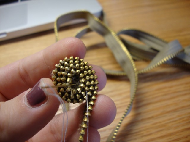 As you wrap the zipper around, sew in and out of the outer layer and the next layer in. To make it easier, you can cut some of the fabric attached to the zipper but make sure to leave at least an 1/4 inch.