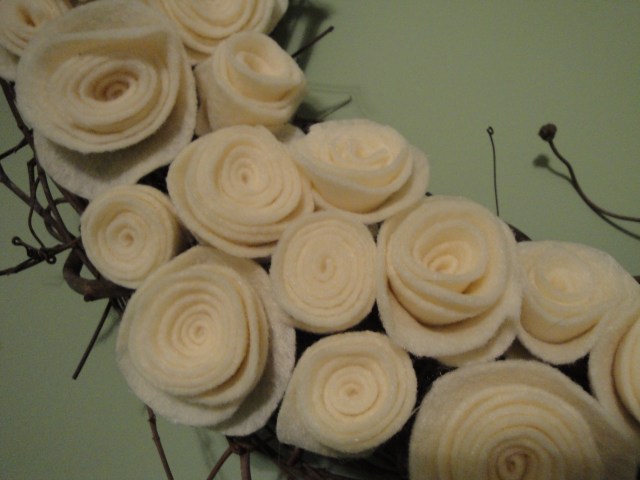 Felt flowers are super simple to make. To make enough to fit on this wreath, I simply bought a half a yard of white felt. Cut out the felt using a CD as a stencil, and then cut the circle into a spiral. To create the flower, simply roll up the spiral, starting from the outside. Once rolled up, use a dot of hot glue on the final flap to secure it in place.