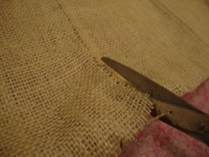 Thanks to a very informative trip to JoAnn Fabrics one day, I finally learned the easiest way to cut burlap. (see technique here)