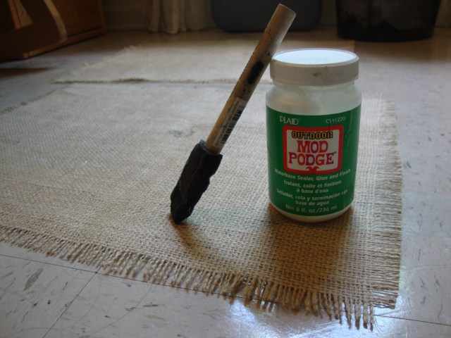 For the place mats, I cut a 15×20 inch rectangle. Once cut, I wanted to create a frilled edge, so I peeled away a few strings (about an inch along the edge). But then to make sure the edge wouldn’t continue to unravel past the point I wanted, I used ModPodge to secure the edge.