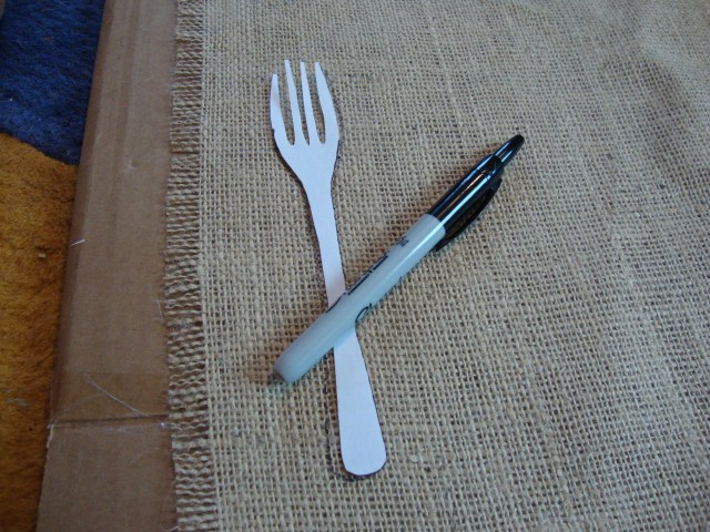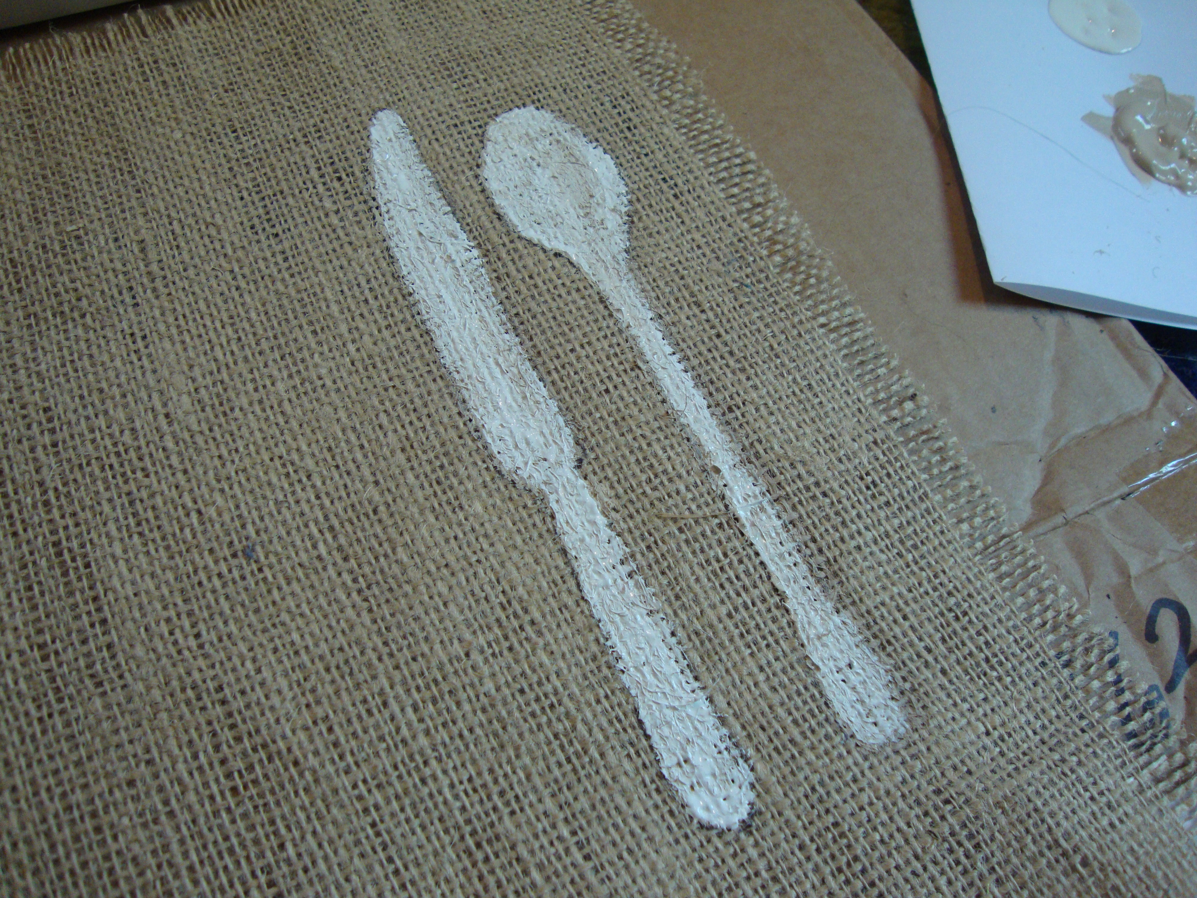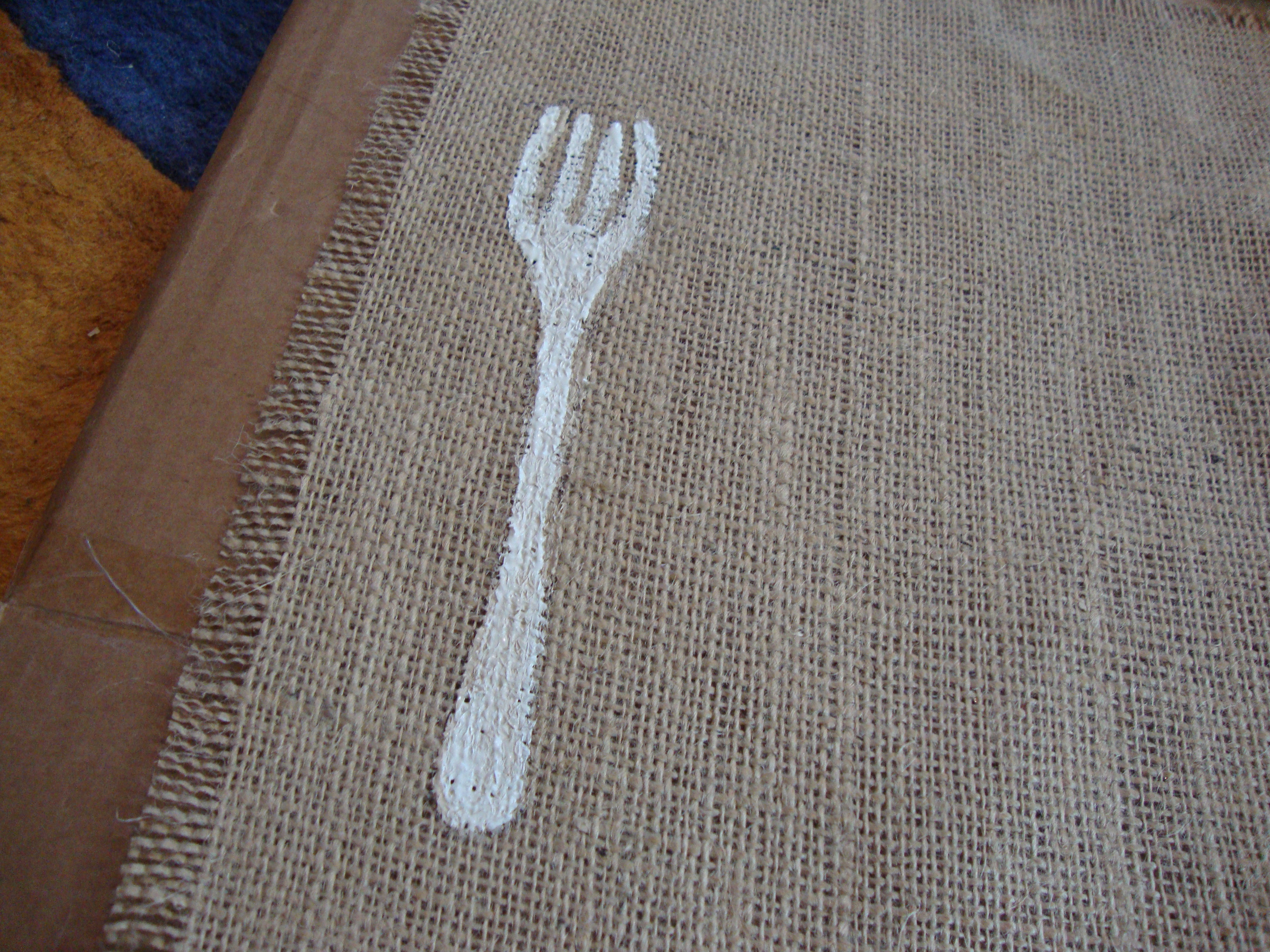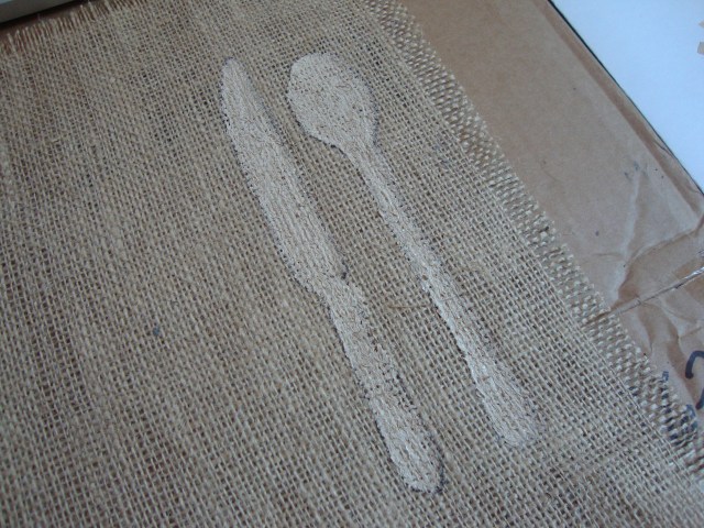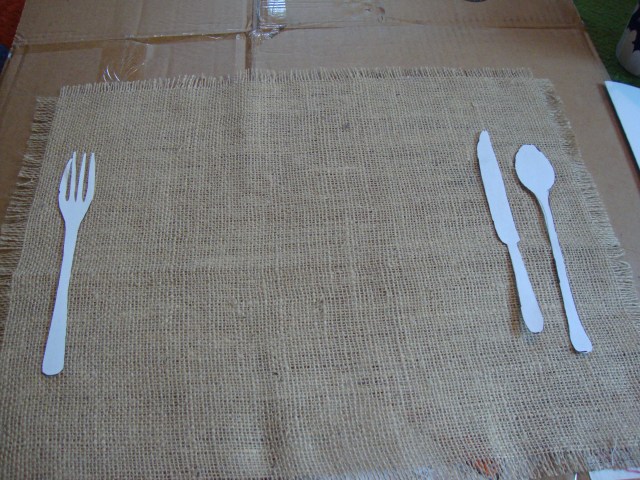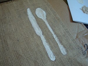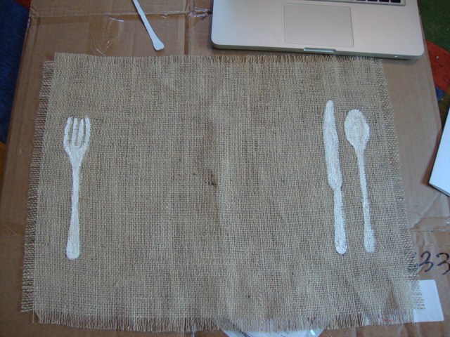 The place mat I saw in the store had painted on two parentheses, as so that they would surround the plate. I liked this idea a lot, but I didn’t want to flat out copy the place mat I saw in the store, so I decided to change up the design using the basics – the knife, fork and spoon. I cut out a template first out of basic computer paper and used a sharpie to outline the design on the burlap.