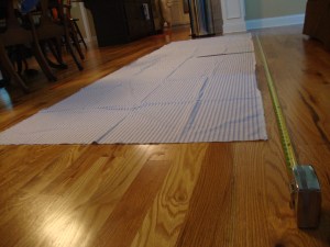 I purchased 3 1/2 yards of a 44″ light purple, striped fabric for the bottom layer. To make it work, I simply cut it in half (two 65 inch long pieces) and sewed them together to make a 65 x 88 inch rectangle.