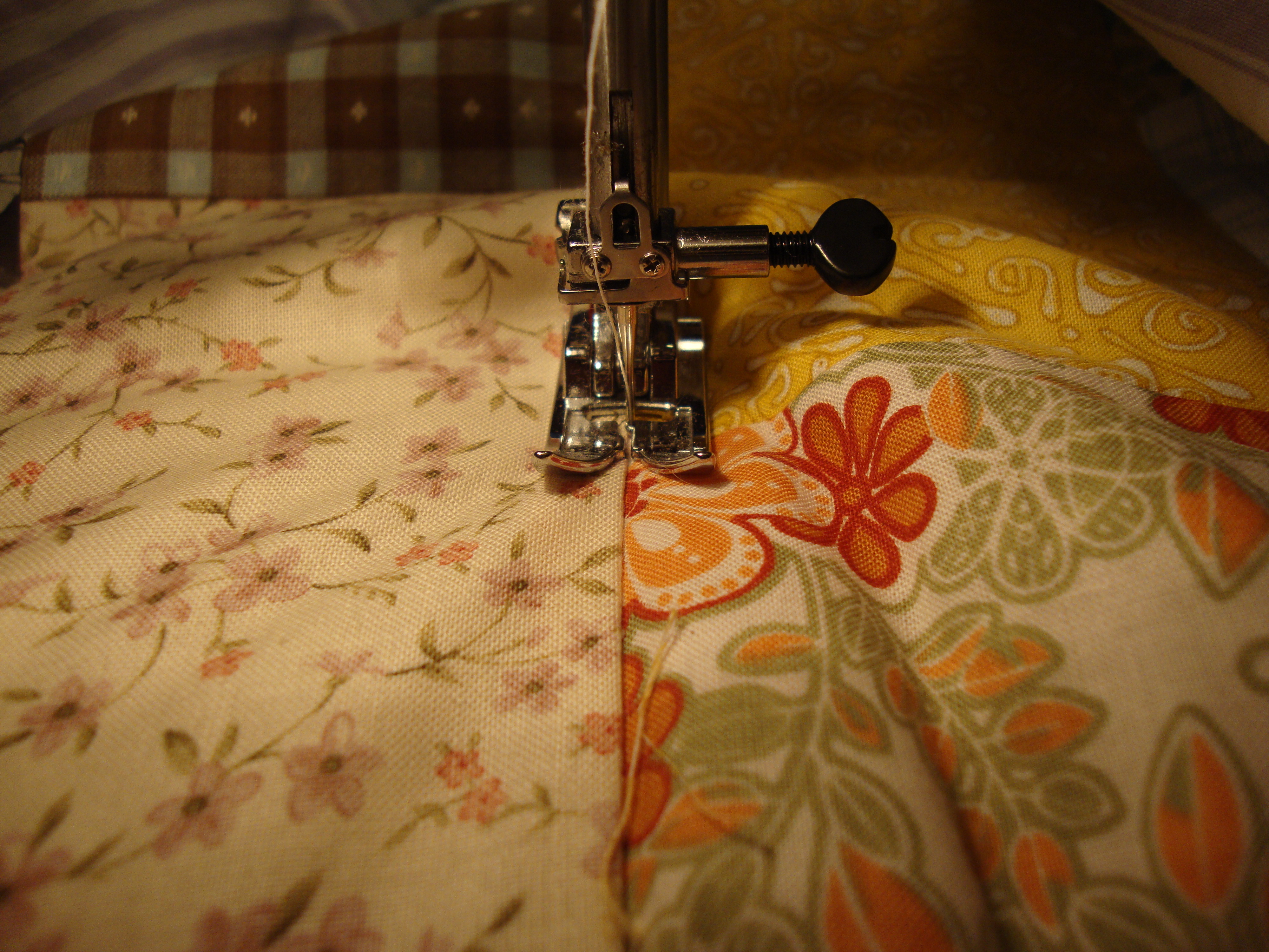 Then let the quilting begin. I had big dreams about using an embroidery foot to quilt a swirling pattern, but the foot was never purchased so I’m stuck with straight lines. I decided to simply sew along the seams of the rectangle patchwork.
