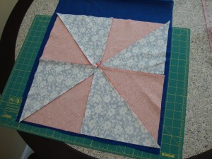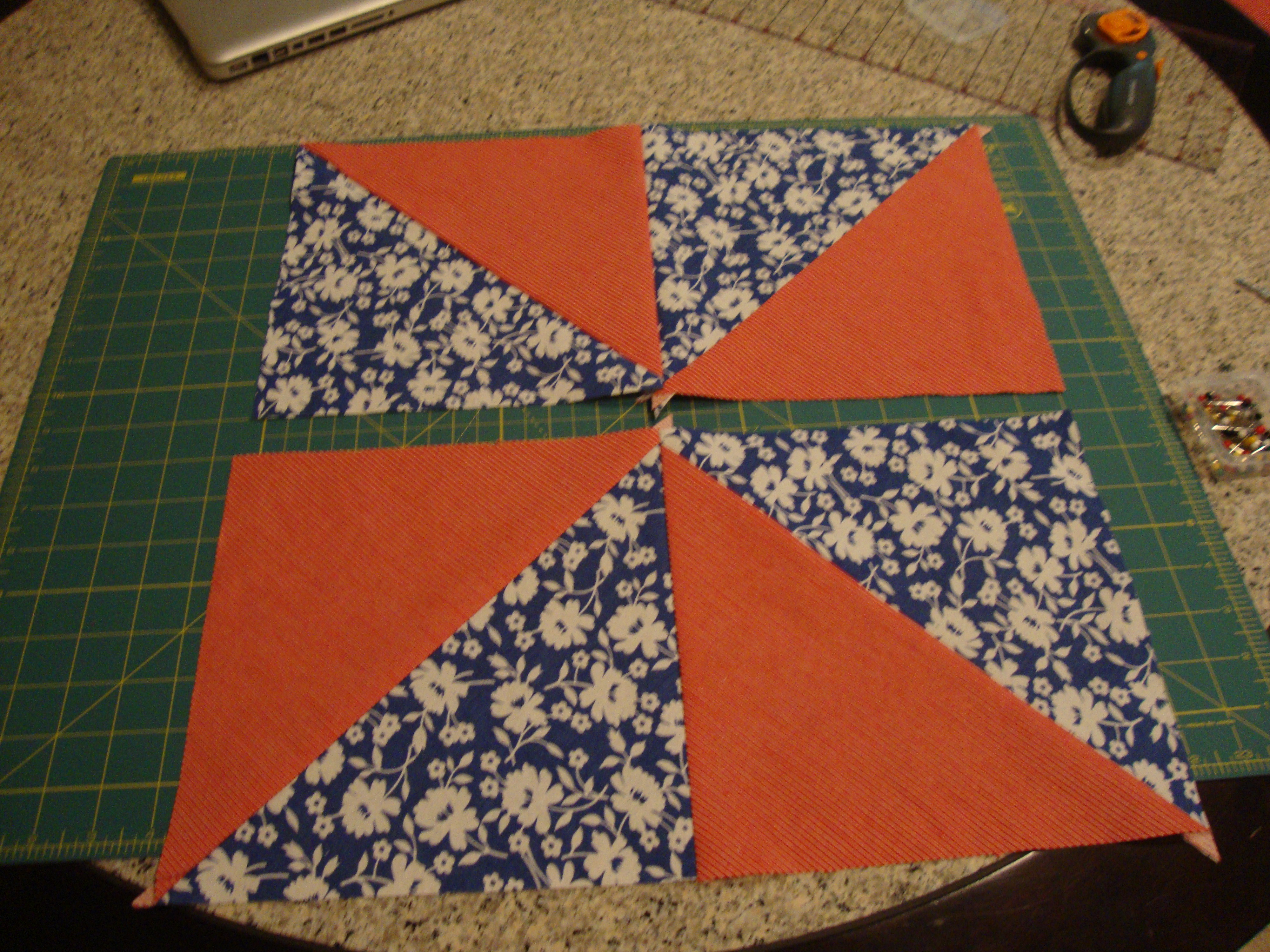Next, I cut 2 diagonal lines. This created 4 squares with perfect half triangles. I then arranged it into the pinwheel design.