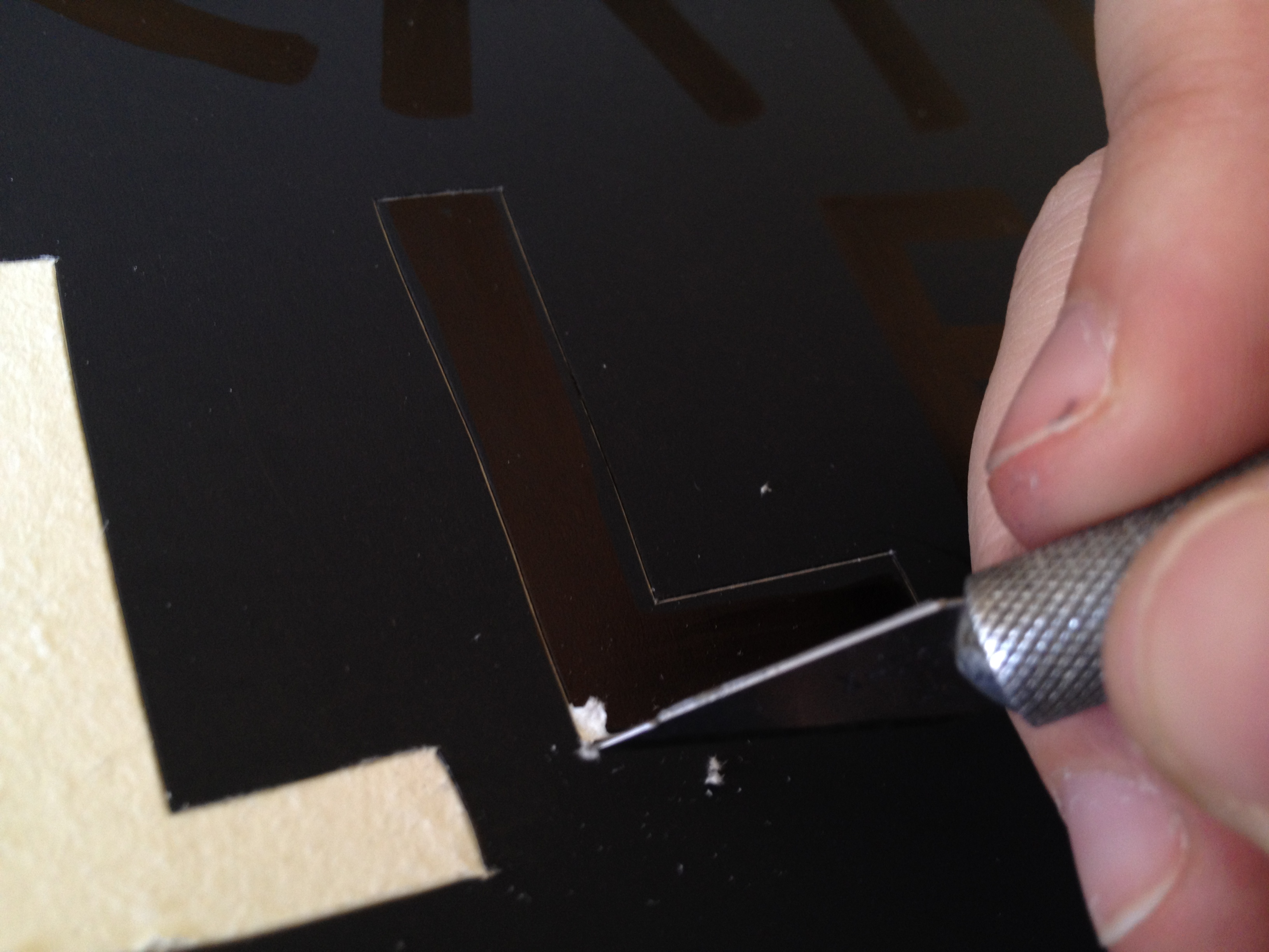 I found black poster board at Walmart, so for the two posters I made with it, I played around a little more. For my name, I only pealed back the black layer.