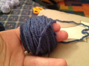 Step four:  Cut through the yarn on the opposite side of the knot. This will result in a crazy-looking pom pom. You’ll have to cut a lot of yarn off before it starts to resemble the finished product.