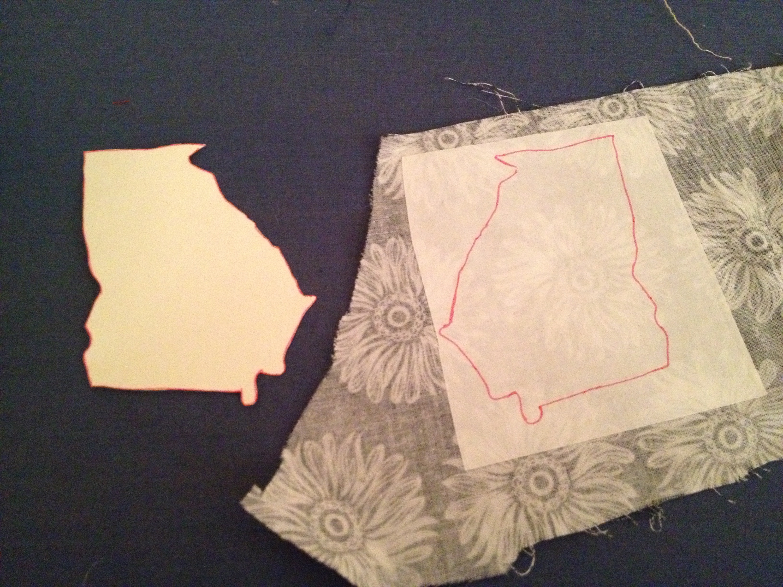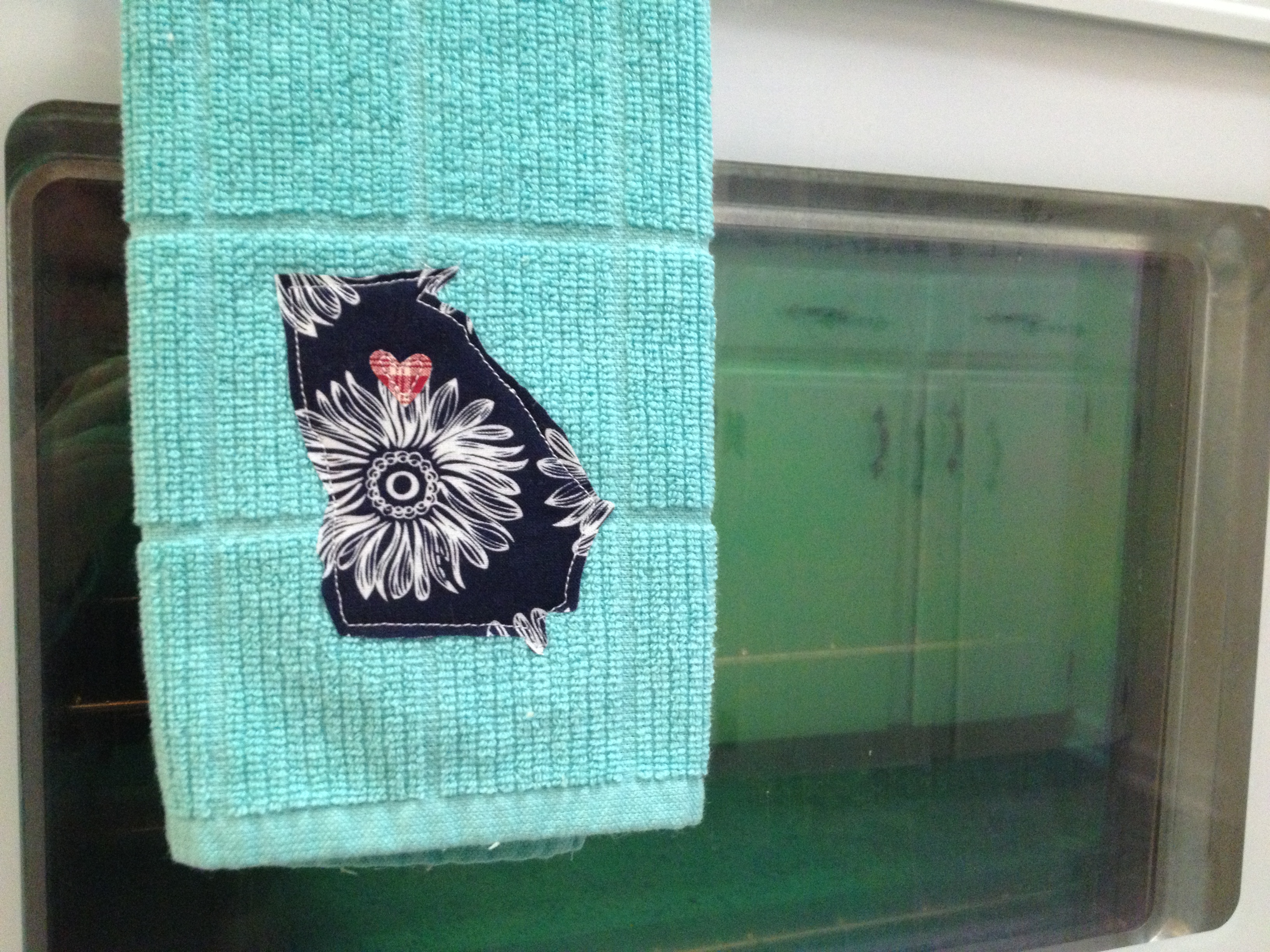 IMG_2135To use the Heat n’ Bond, I traced my chosen state (Georgia) off my iPad. I then traced the reverse image on the back side of the Heat n’ Bond paper. Using an iron, I attached the paper and then cut out the shape. I then ironed on the fabric to the towel and used my sewing machine to secure it in place.