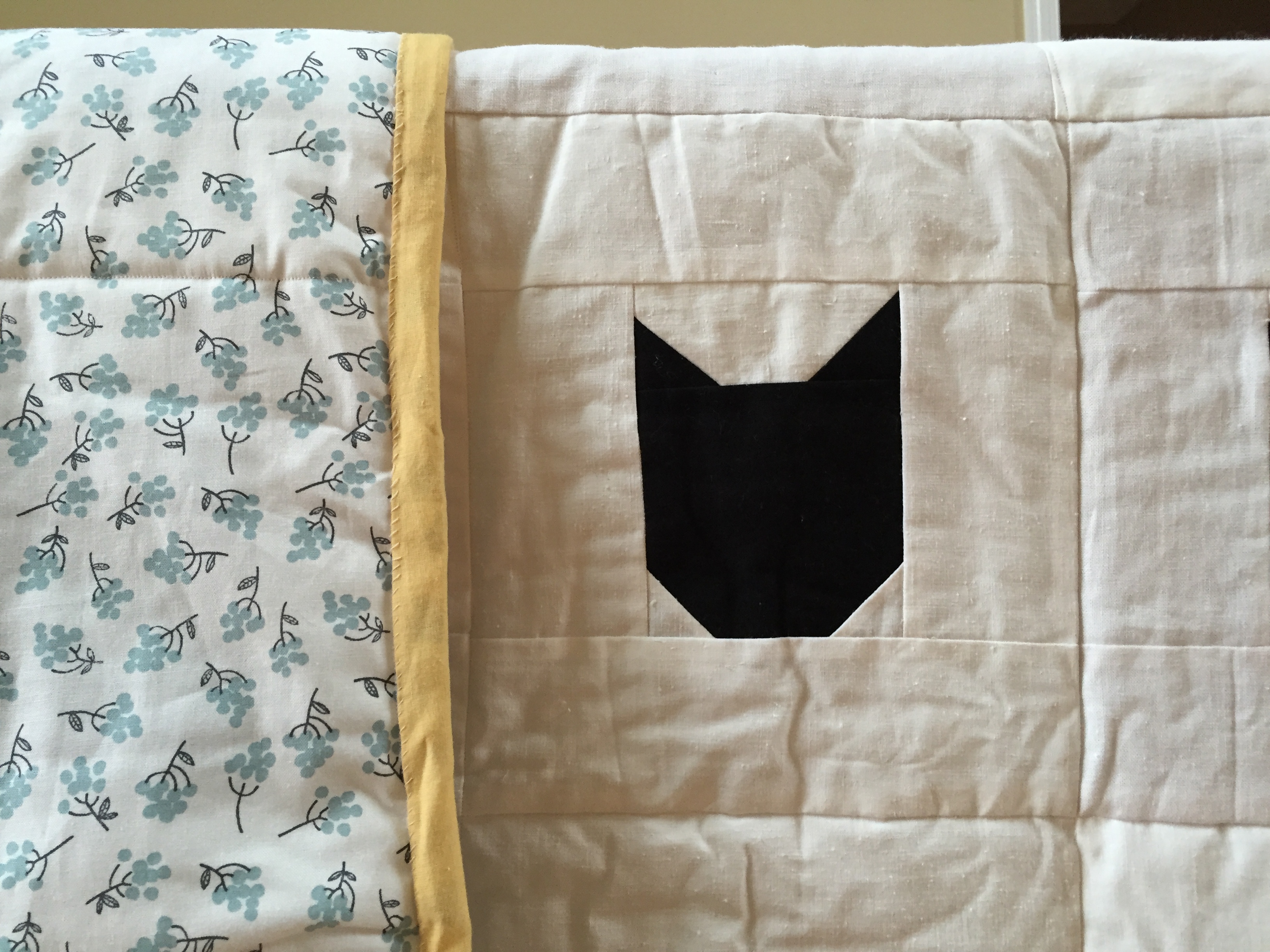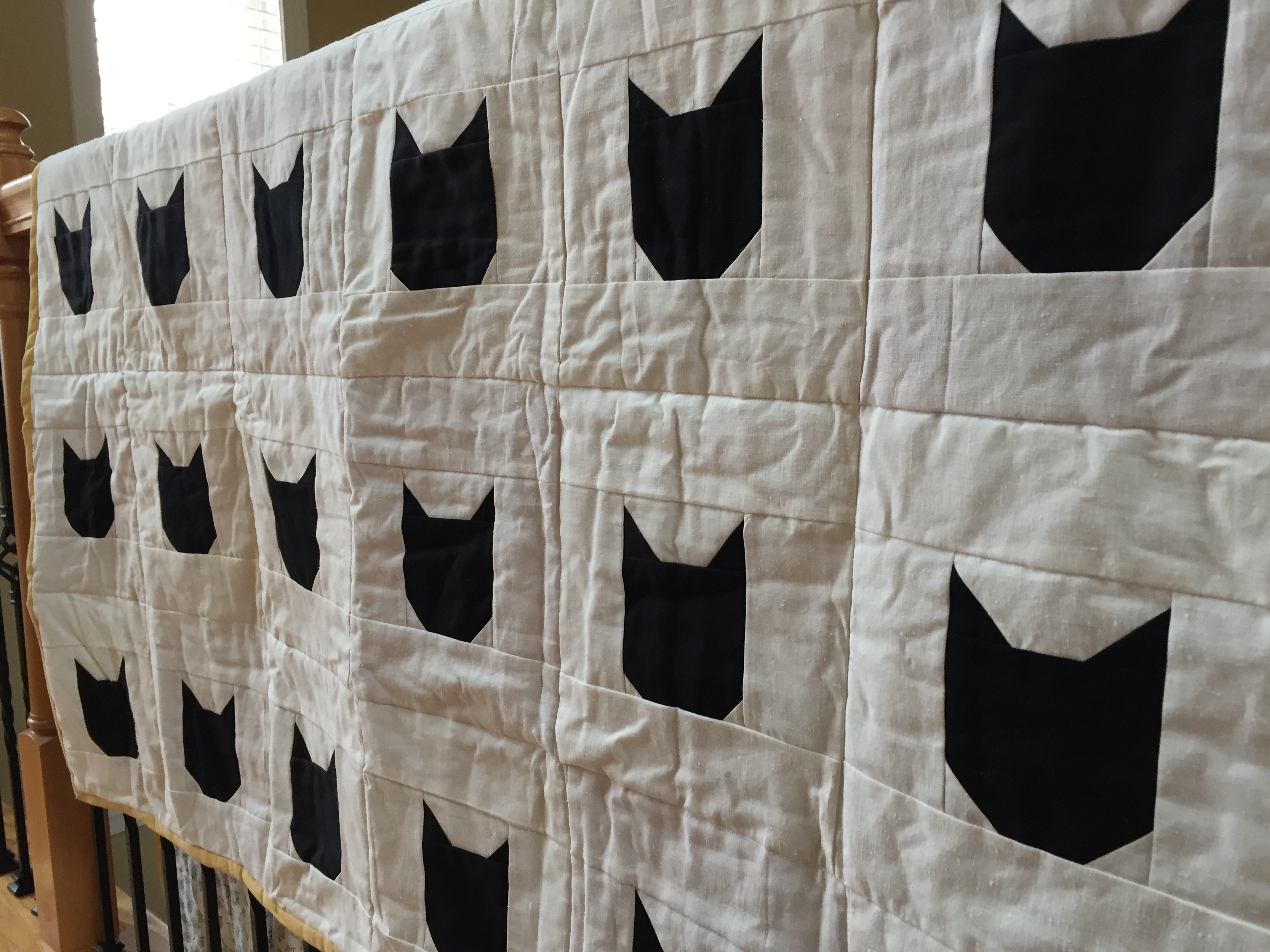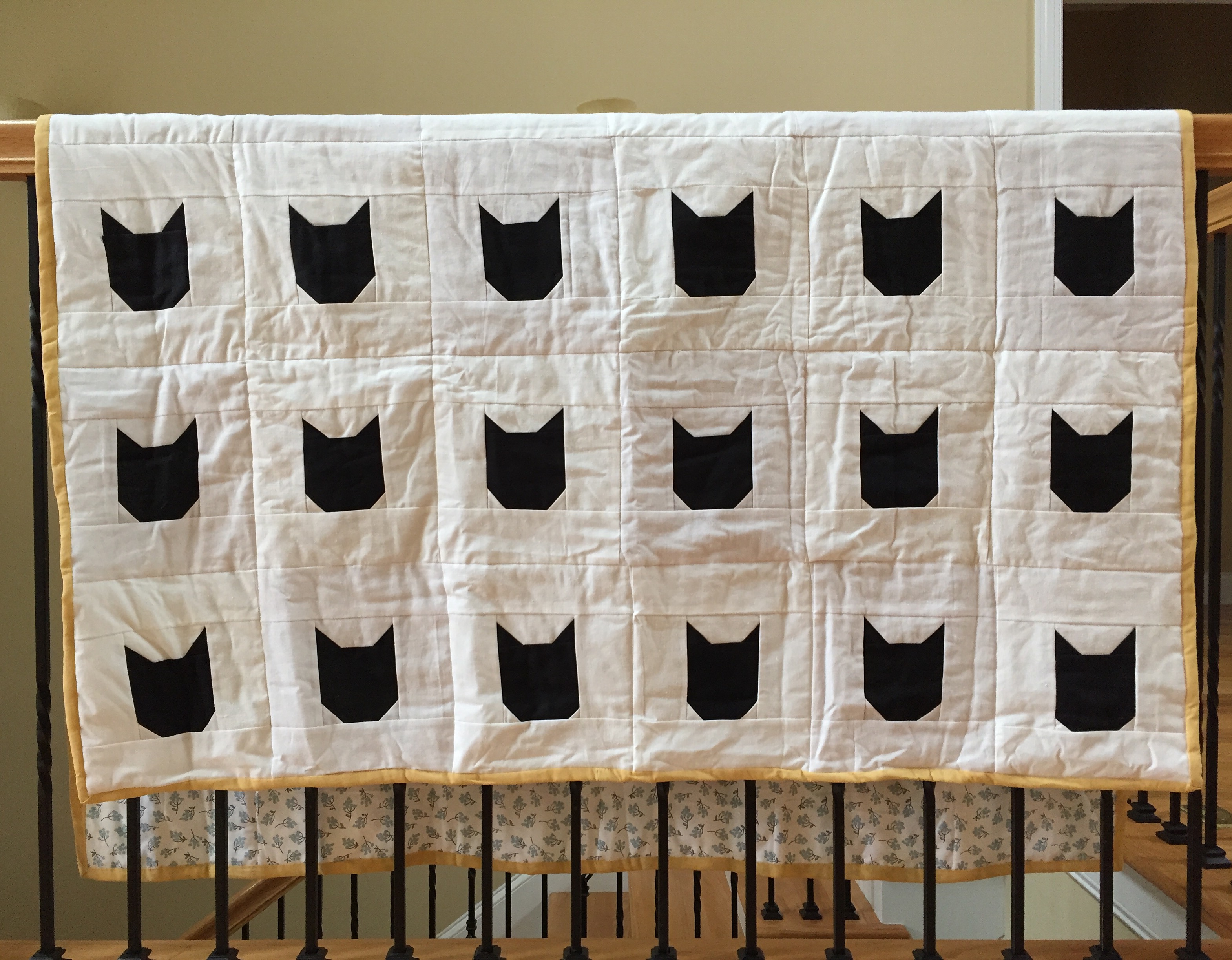 Over the 4th of July, my family lost our black cat, Bosley. He might have been a stubborn, little cat, but we sure did love him. Awhile ago, with the help of Pinterest, I stumbled upon mermag.blogspot.com and this fantastic pattern for a black cat quilt. This fall, I decided to make it for my mother’s birthday. I figured that a quilt would help keep her warm this winter since Bosley would not be by her side. The final result was fantastic, and thanks to Merrilee’s pattern, it was quick and easy to make!