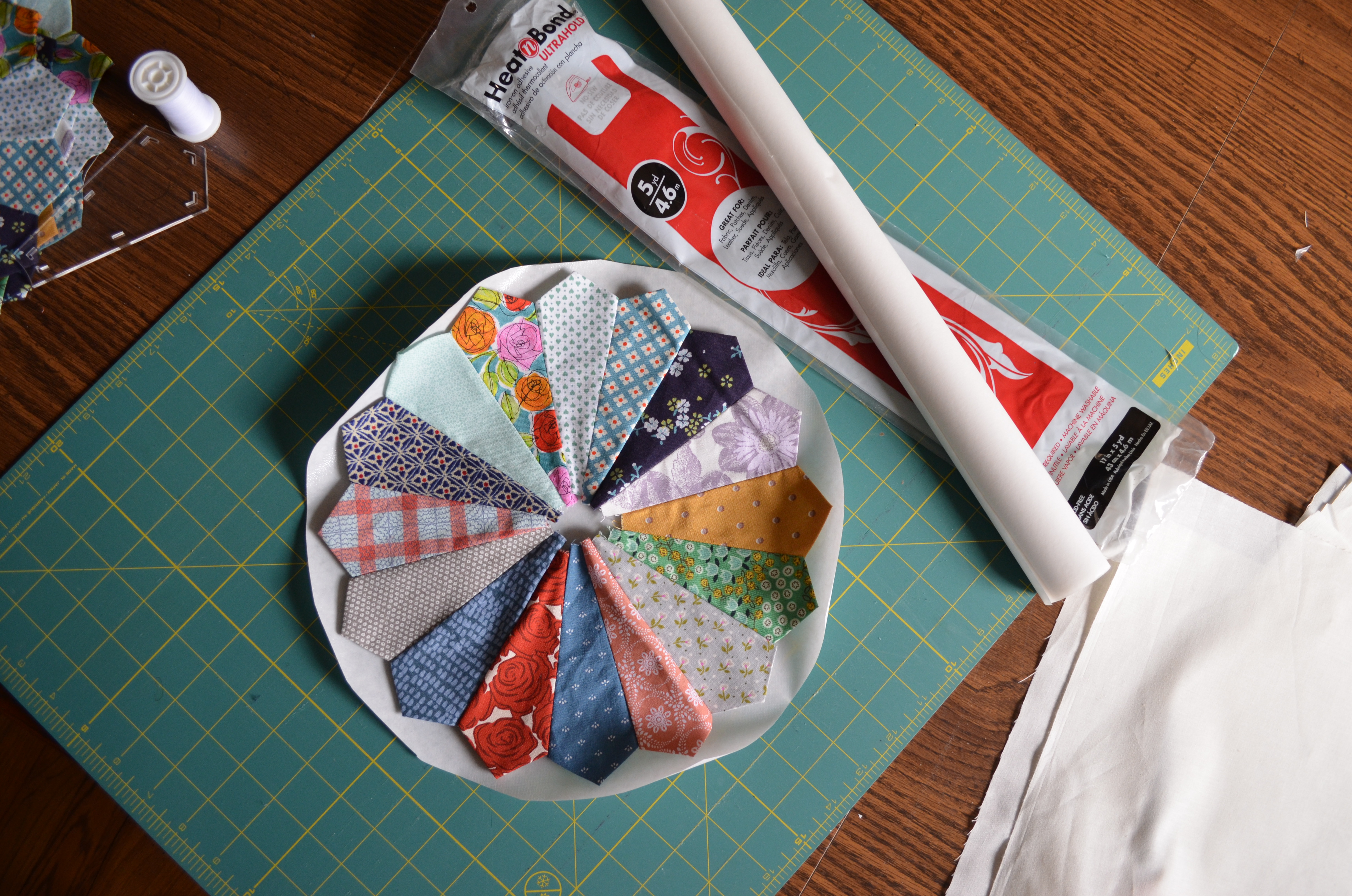 Now some tutorials will show you how to hand-applique the plate in place, but I decided to cheat and use heat n’ bond iron-on adhesive. I cut a piece of adhesive to be smaller than the plate, leaving the outer points untouched. (A downside of using iron-on adhesive is that it will make the fabric stiffer, but I find it so helpful in keeping the fabric in place.)