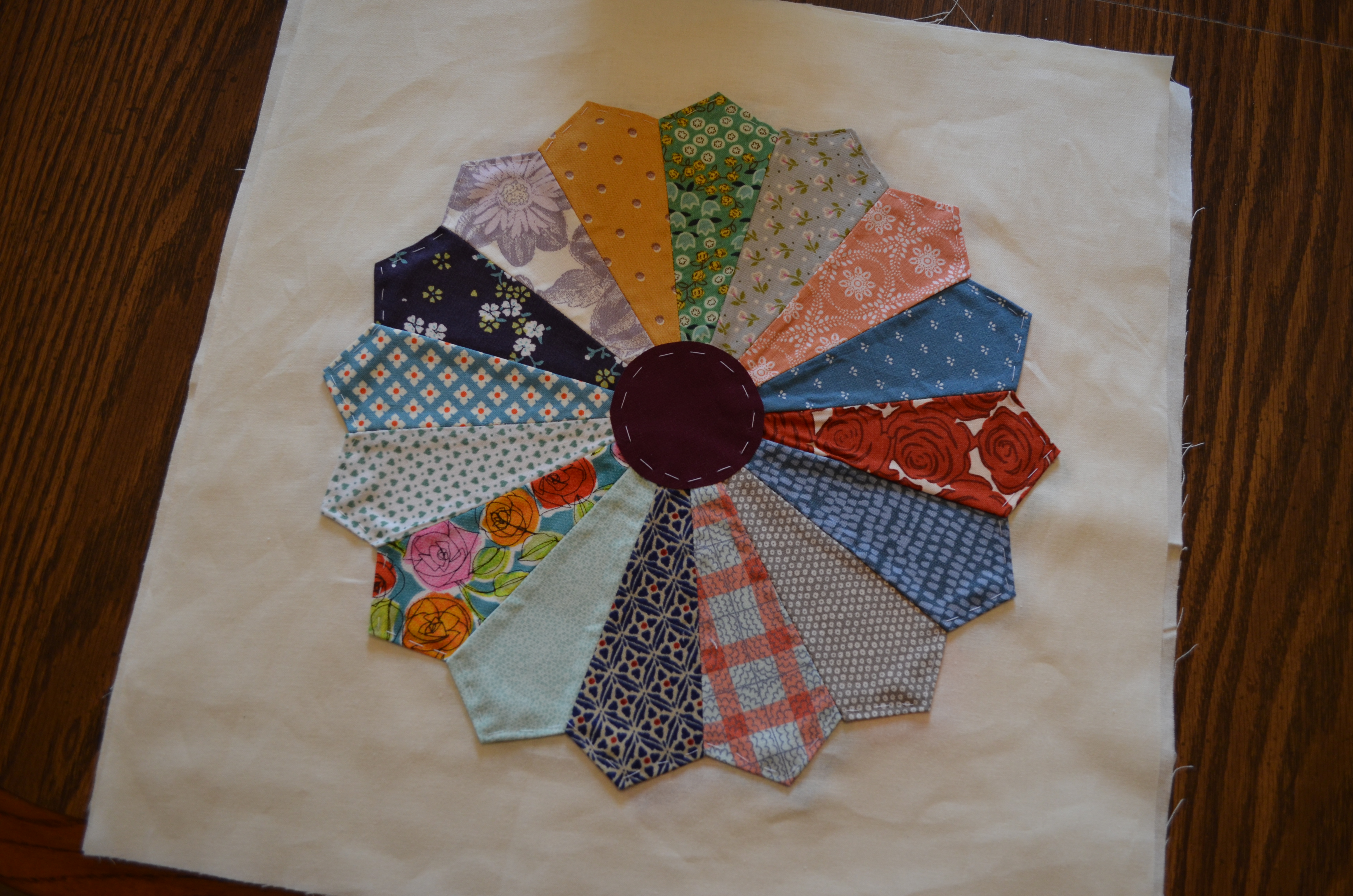 The pattern is called the Dresden plate. (I also heard it be called the flower or floral plate.) The idea has been floating around in my head ever since I finished my last quilt (as my Pinterest board can attest.) Finally, I bit the bullet (a year ago) and purchased the template blocks and got started.