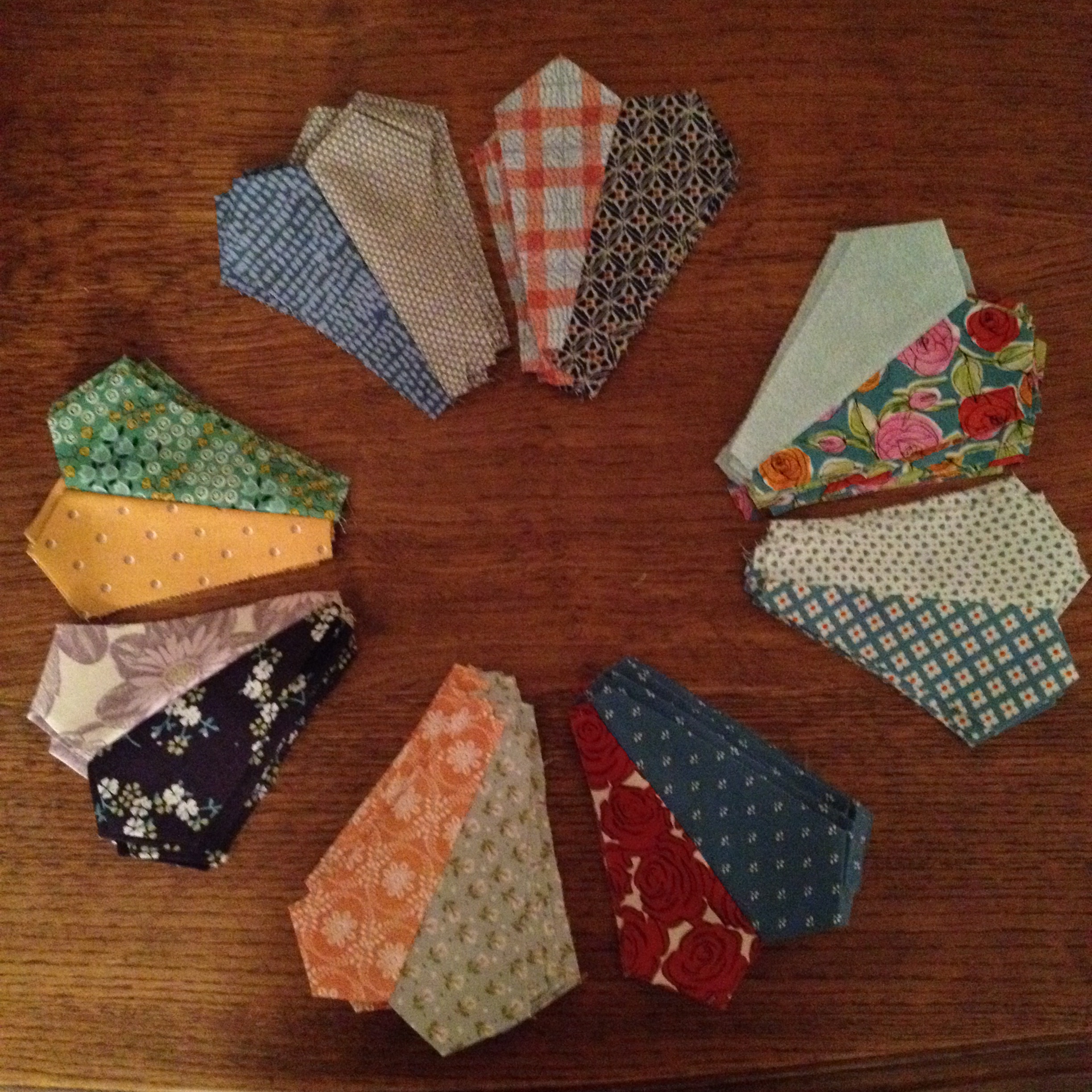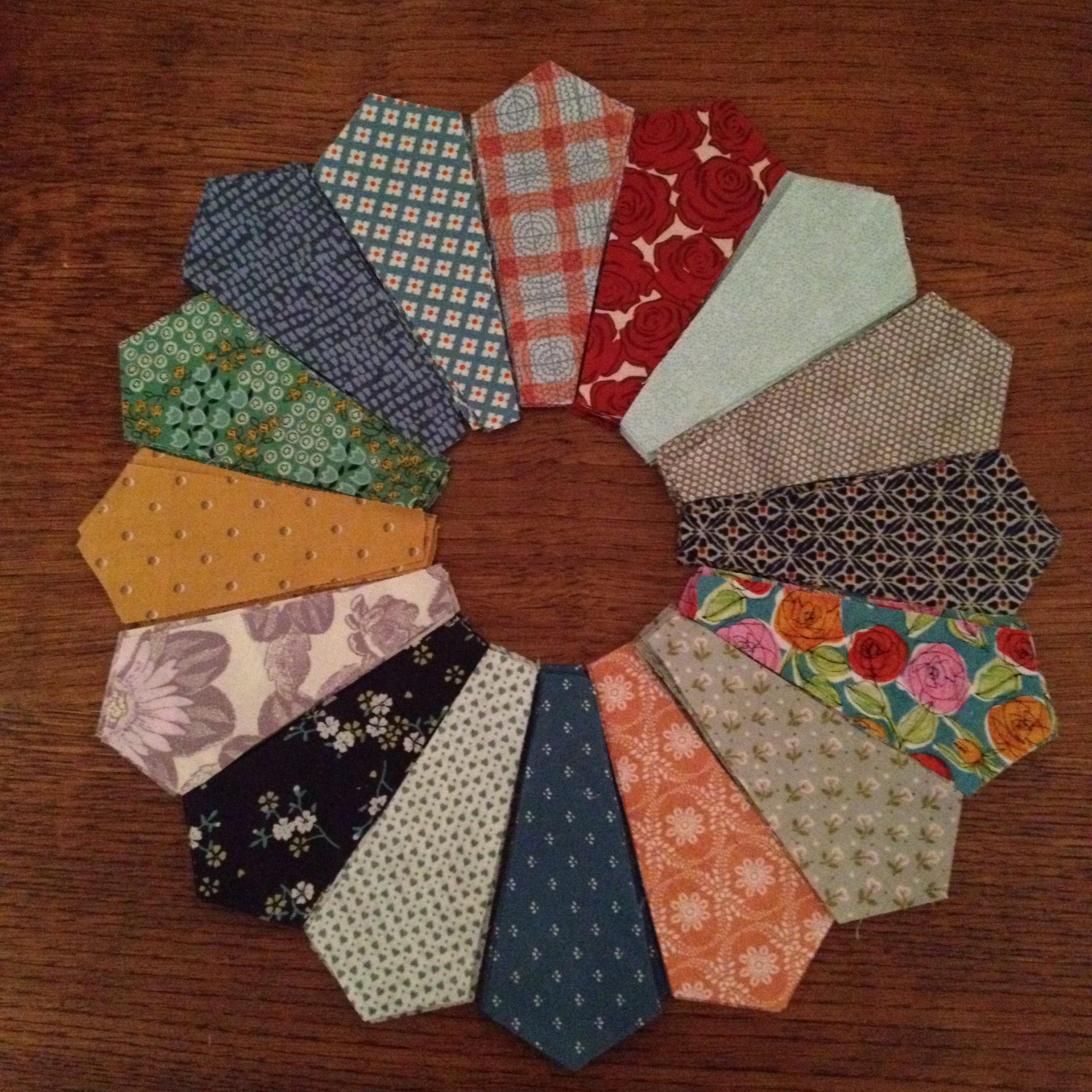 Piecing this pattern is a two step process that involves a lot of ironing. Step one: cut out the pieces. I used the template, a rotary cutter and mat to cut out each piece. I then took the top of each piece (where the fabric comes to a point), folded over a 1/4 inch seam allowance and pressed the seams. Step two: sew pieces together in sections. Instead of sewing the ring together piece by piece, it is much easier to work in sections: sewing pieces into pairs – stop and iron – then pairs to quarters – stop and iron – quarters to halves – stop and iron – and finally 2 halves into 1 whole circle.