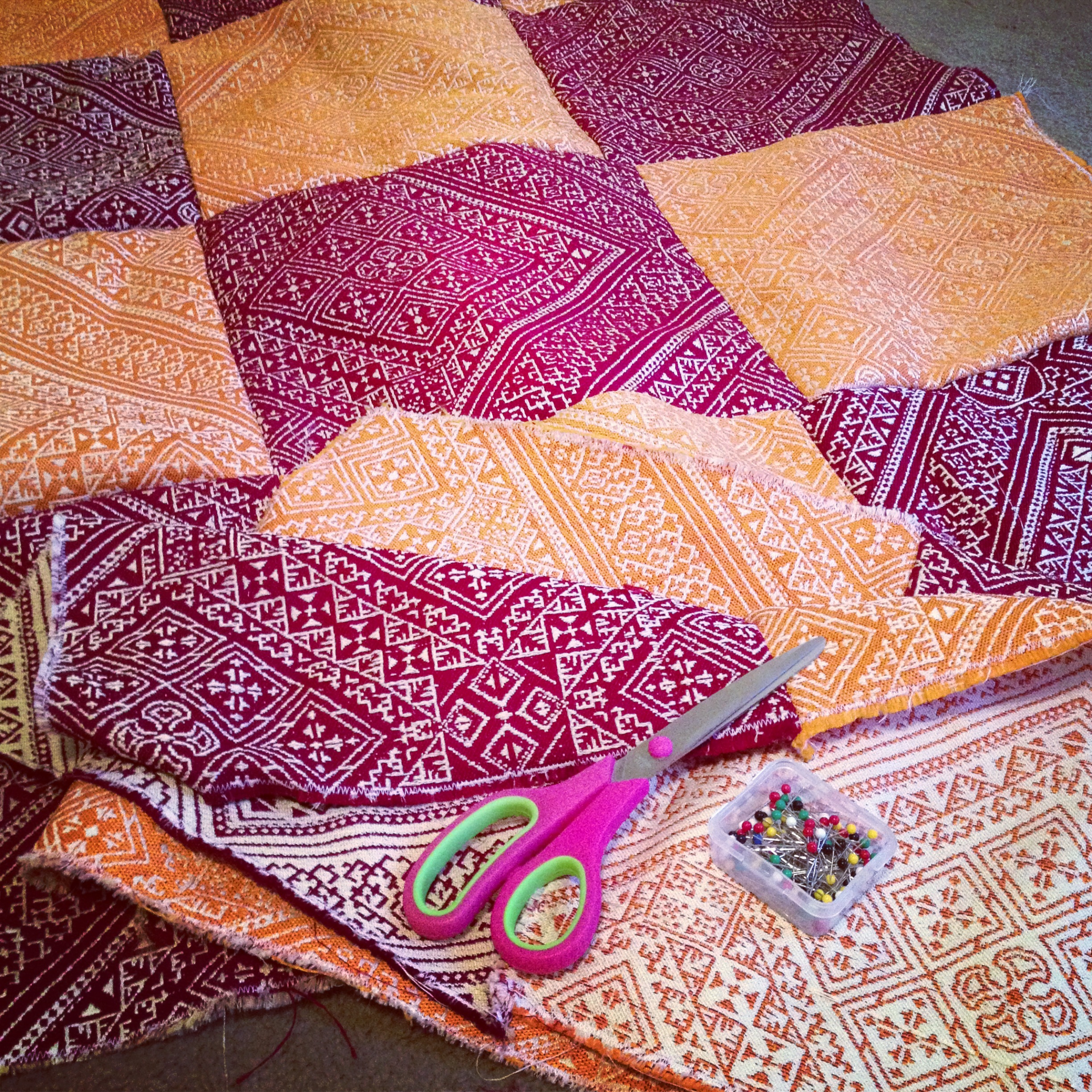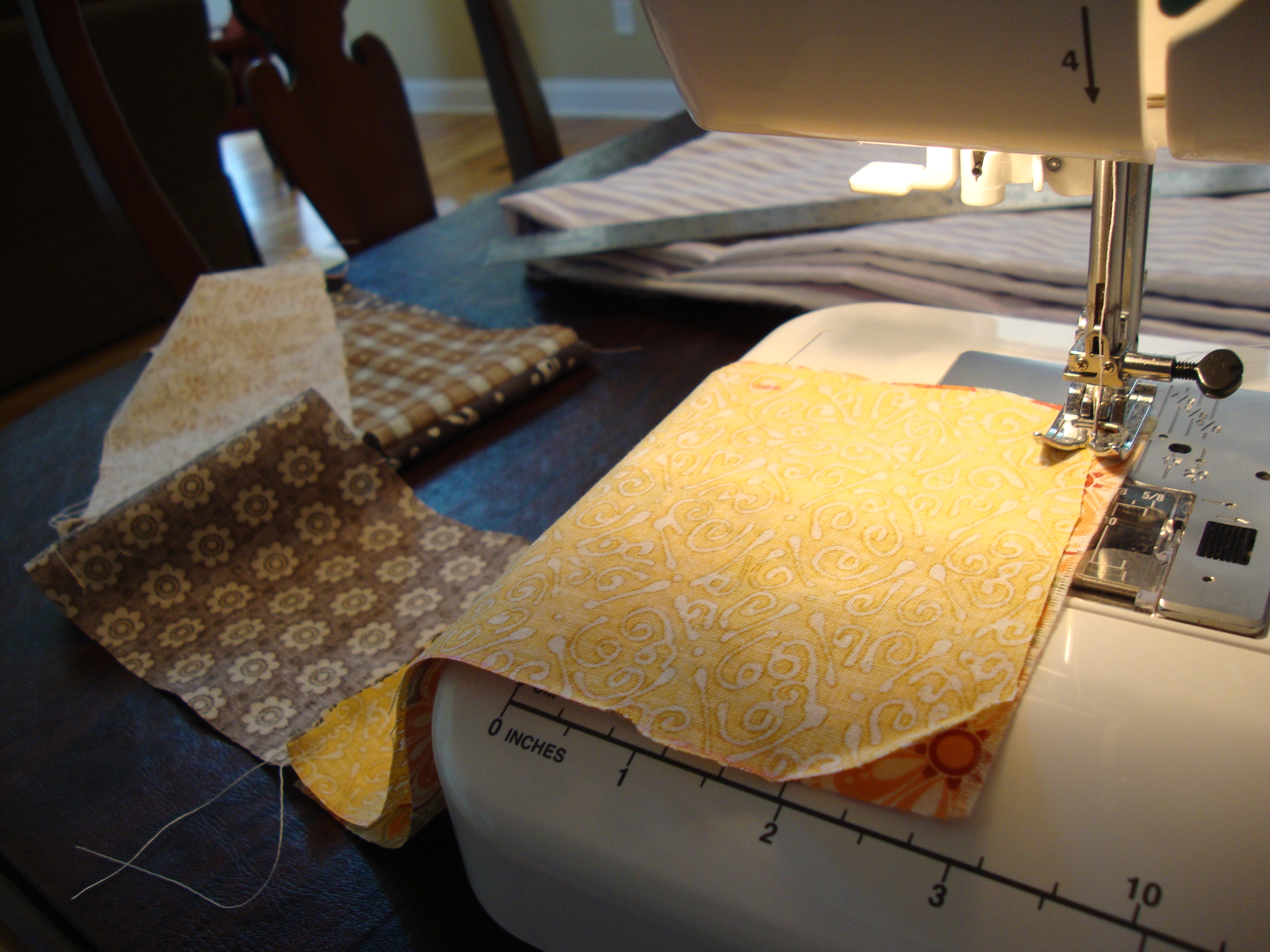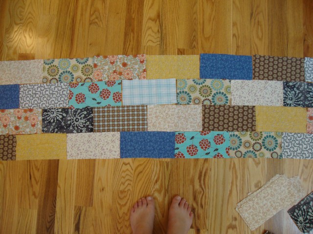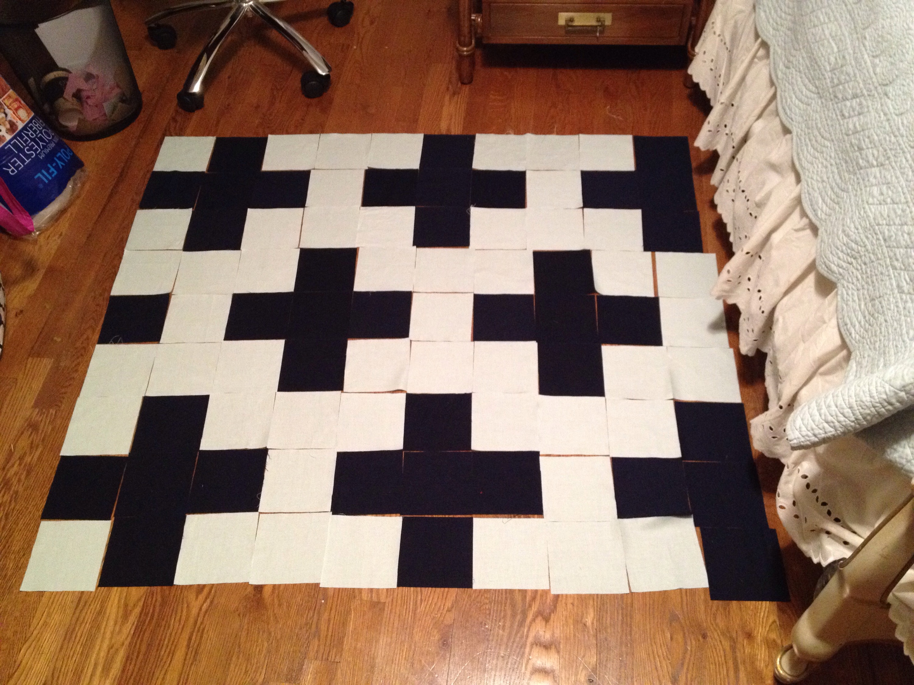 After cutting the 5-inch squares, arrange the pattern on a flat surface (in my case, it’s the floor). Begin sewing the squares together a row at a time (always right sides together). I used a 0.5-inch seam allowance with the basic walking foot on my sewing machine. Then sew each row together. Stop periodically to iron the seams, and after sewing on the last row, iron the entire piece.