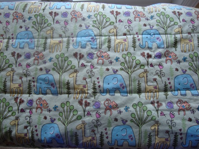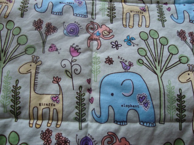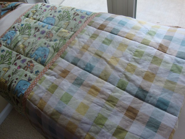 First, take the piece of batting and lay it on a flat surface (again, I use the floor). (I bought a crib-sized piece of polyester batting.) Take the front piece and lay it on a flat surface, with the wrong side facing up. Spray with temporary spray adhesive and let stand for a minute or two (this step is best to do outside). And then lay the front piece on top of the batting, smoothly the fabric as you lay it down. (It’s helpful to have a friend hold up one end as you smooth.) Flip the batting over and do the same with the back piece of fabric. (The back piece is a larger piece of fabric, but still make sure it lines up with the front piece. Once complete, I pin safety pins around the quilt as a precaution to keep the fabric in place.
