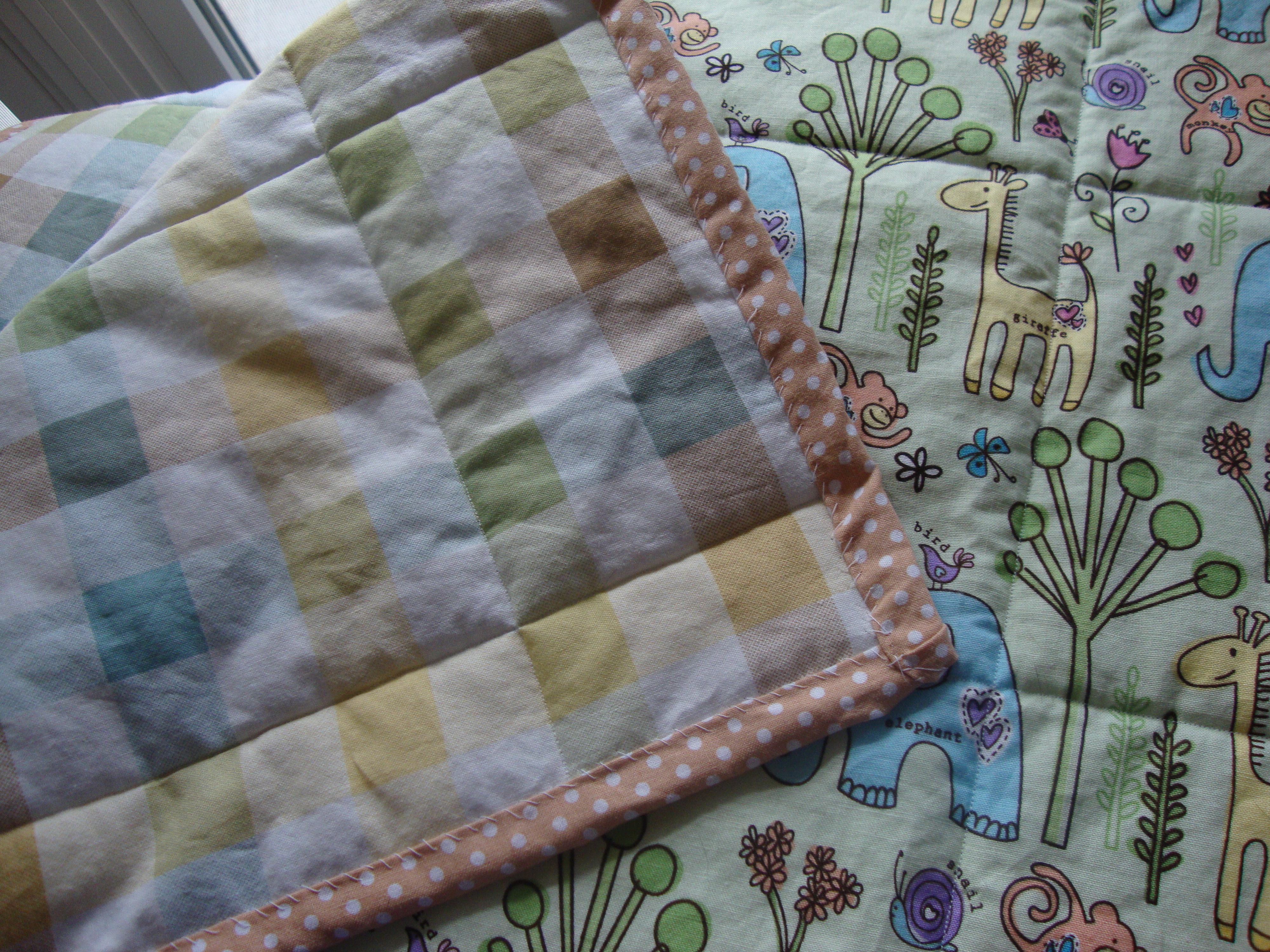 The final step is calling binding, the creation of the quilt’s edge. Since I had a lot of blue in a quilt made for a girl, I went with a pink binding. (I think it’s important to pick a color or fabric that helps connect the pattern and colors of the front and back pieces.) First, cut out several 2.5-inch strips, and sew them together so the fabric measure the lengths + the widths of the quilt. (I can’t remember the exact dimensions.) Iron down 0.5 inch on one side, and then pin the strip of fabric to the front side of the quilt (remember, always rights sides together).