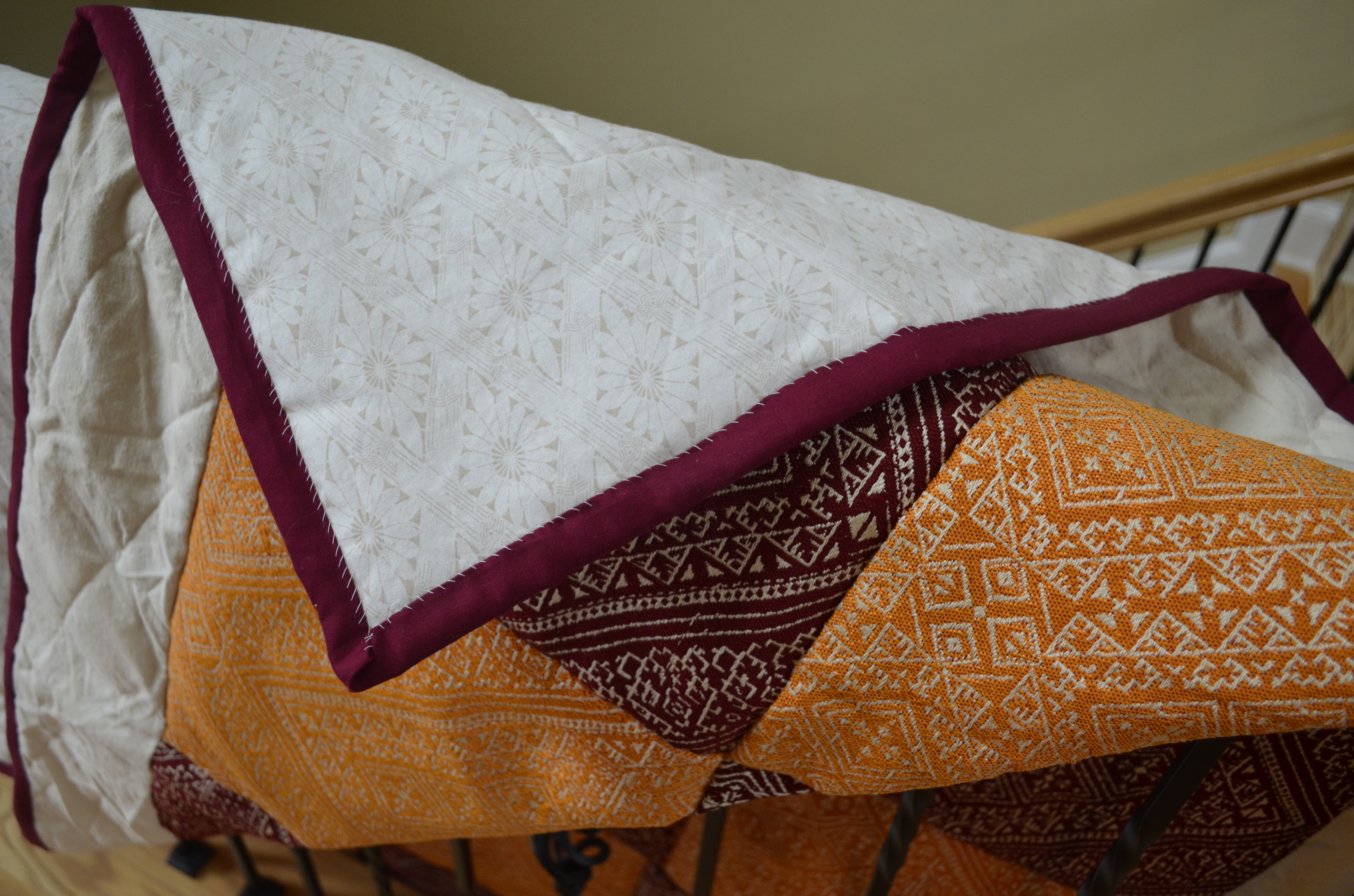 With the one edge of the binding in place, I fold the fabric over the edge and whip-stitch the other side in place. (It’s a long process, but I find it easier that machine binding the whole thing!)
