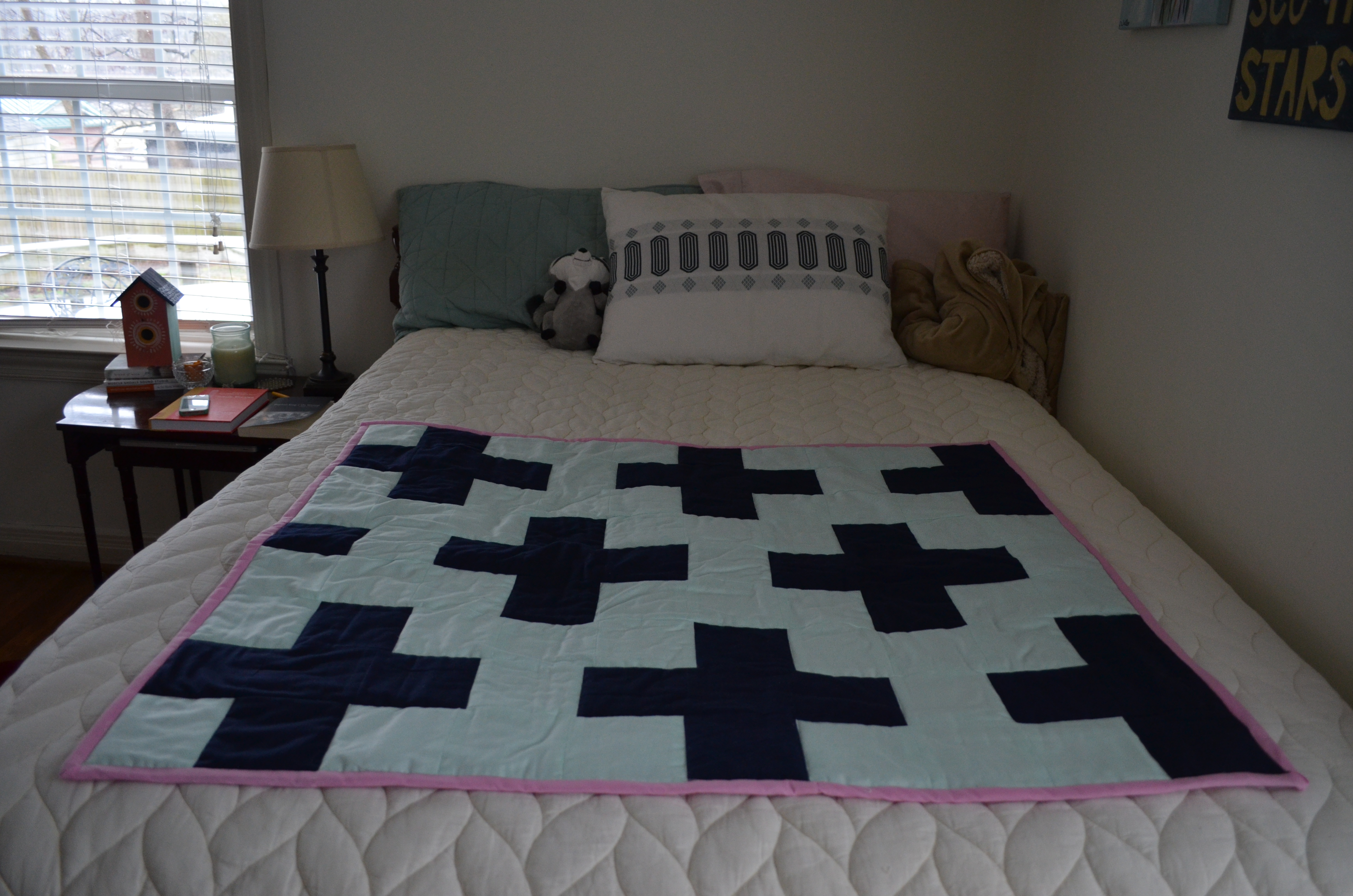 The next step is quilting! Using the “stitch-the-ditch” quilting technique, you sew along the existing seam, creating a quilting pattern that matched the front piece. For this quilt, I sewed along the outline of each plus sign.