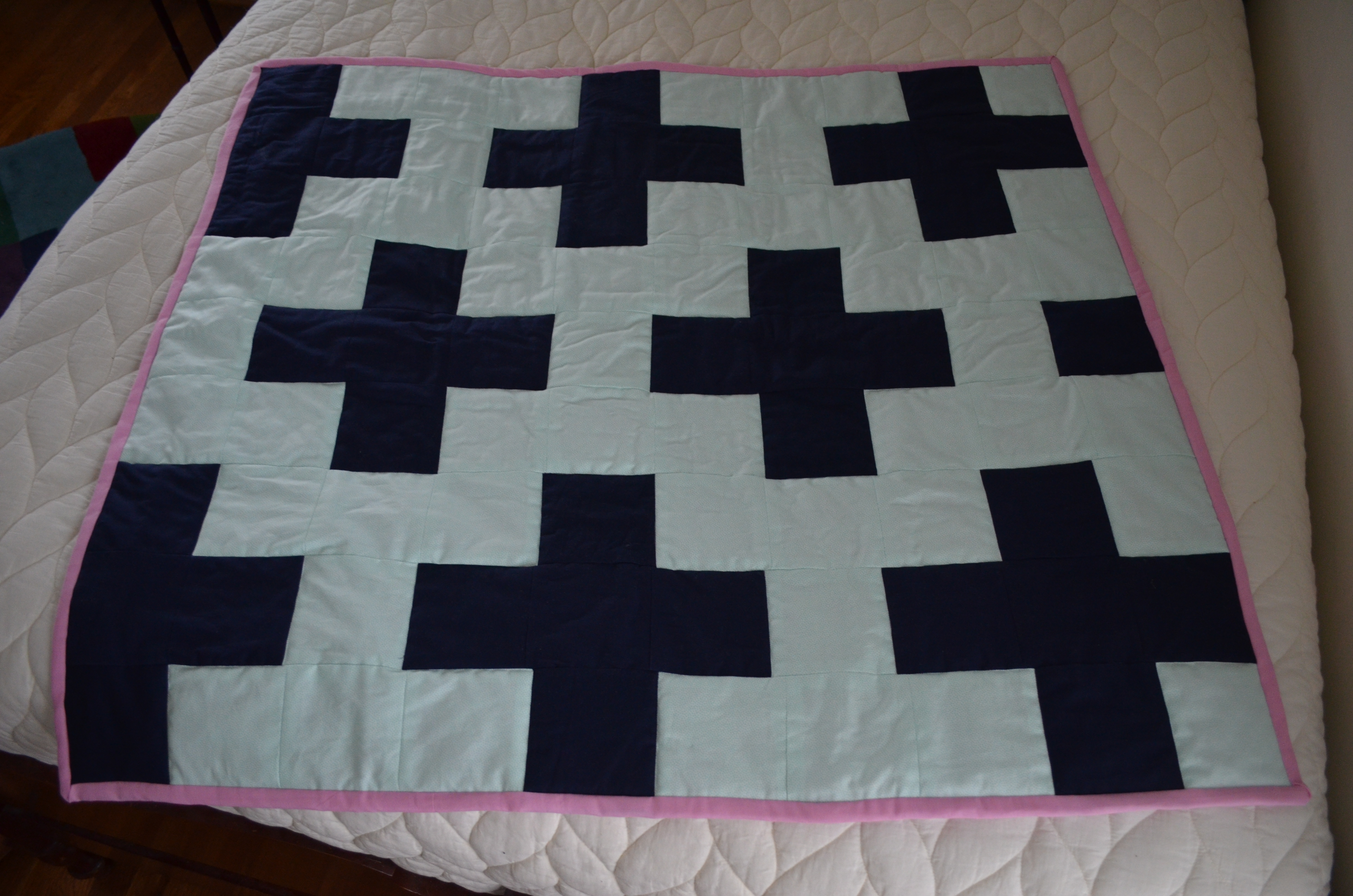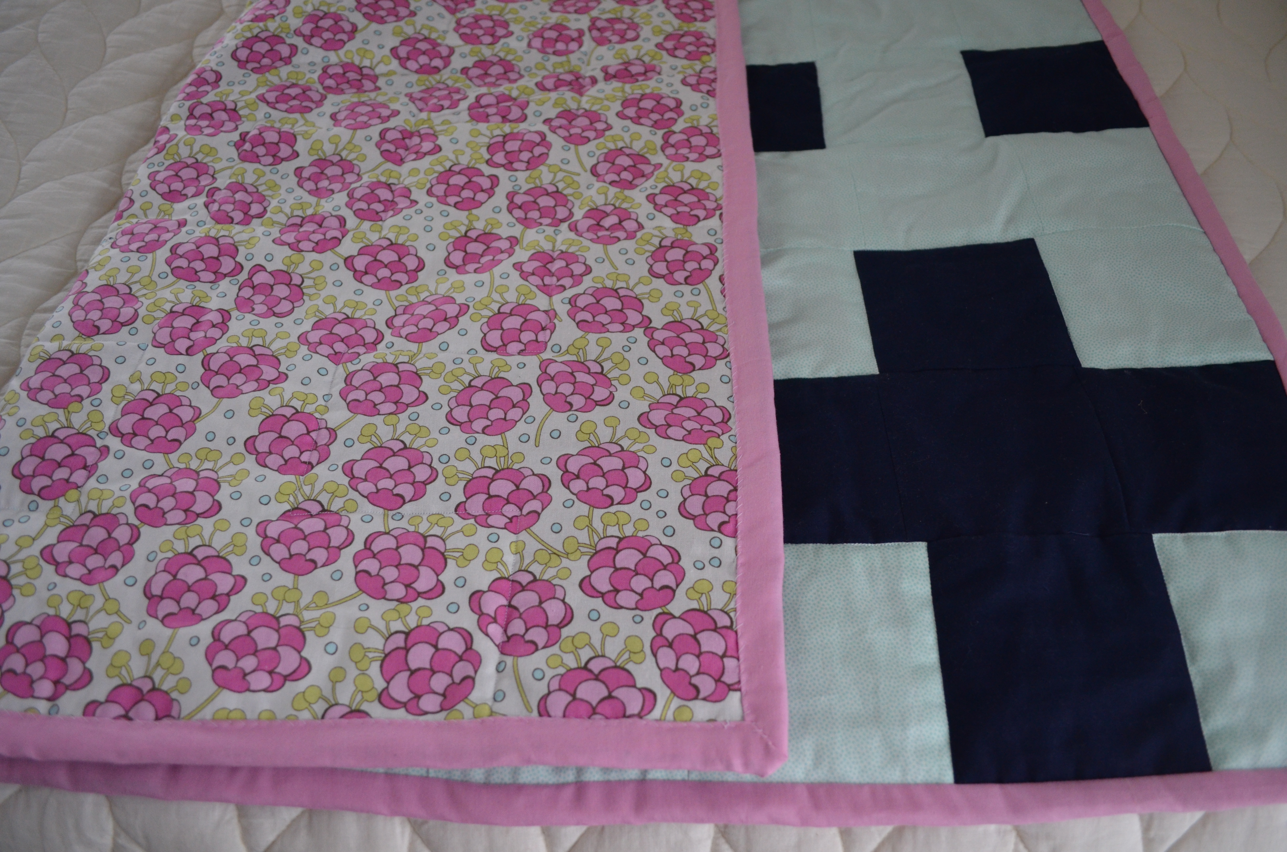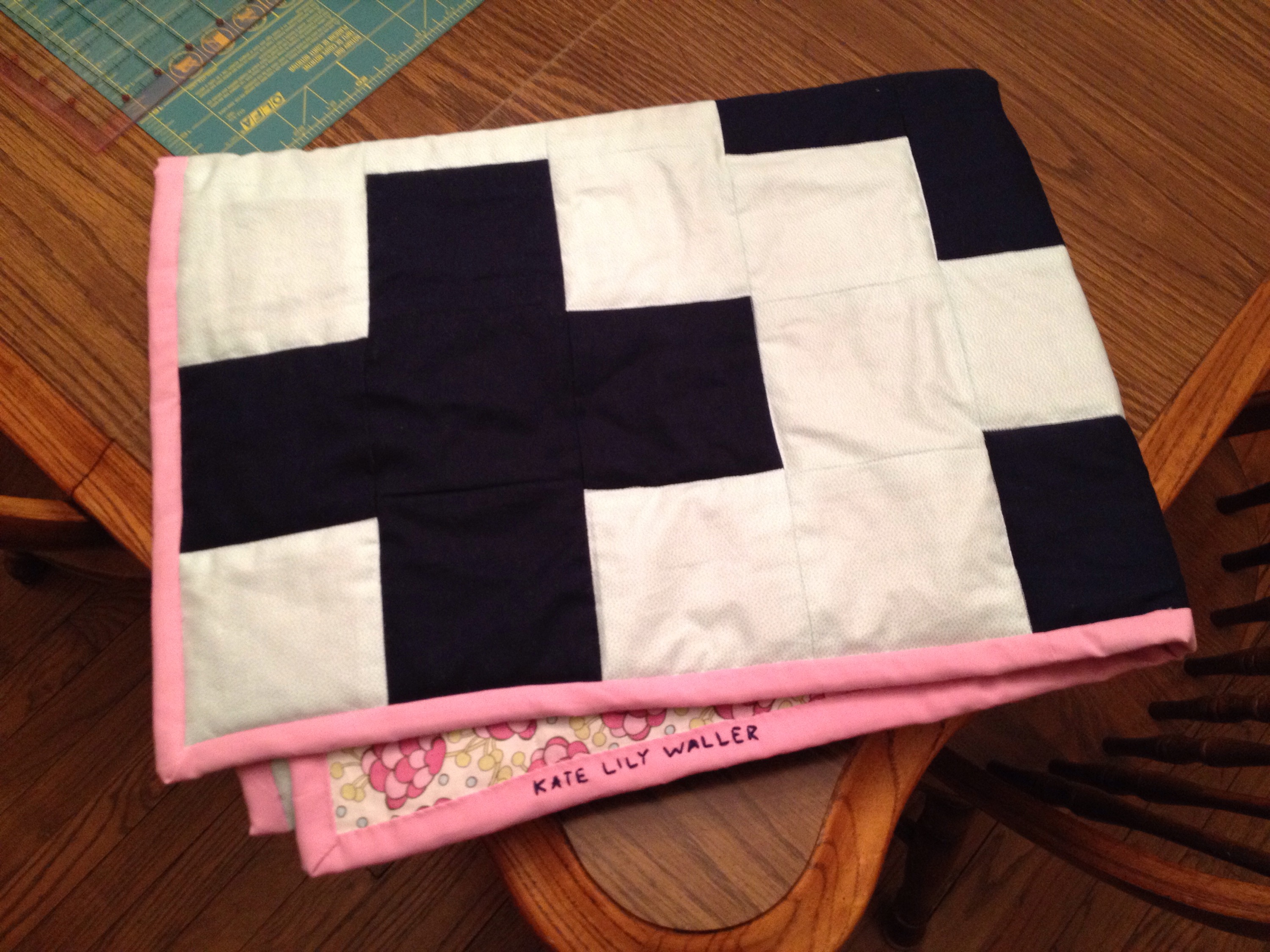 I love the modern twist to the classic gift of a baby quilt. (And I’m a huge of the navy, blue and pink combination.) I did finally get the chance to meet my little niece, and she looks crazy cute wrapped up in this!